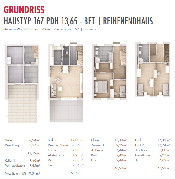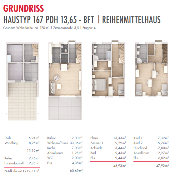 With approximately 168 m² of living space spread over nearly four floors, each house offers surprisingly ample room for individual family life – whether it’s cooking together in the open living area, relaxing evenings on your own terrace, or quiet retreats on the upper floors. Thoughtfully designed floor plans create functional living spaces, while practical storage rooms provide extra space for everyday needs.