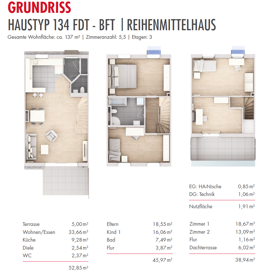 Die Häuser bieten ca. 115 m² bzw. 137 m² Wohnfläche, verteilt auf 5,5 Zimmer und drei Etagen. Ob als Paar, kleine Familie oder Mehrpersonenhaushalt – hier findet jeder seinen persönlichen Rückzugsort.